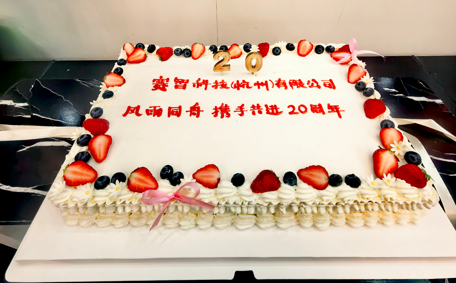 当两位同事把二十周年的生日蛋糕抬上舞台,全场齐唱生日歌,灯光映照着每一张洋溢笑容的脸庞。大屏幕上播放着无数熠熠生辉的精彩瞬间,车间员工的专注装配,打包发货时的忙碌,展会上的自信亮相,客户来访的热情接待以及技术人员的耐心指导......每一个瞬间都记载着赛智科技风雨同舟,携手共进的二十年。